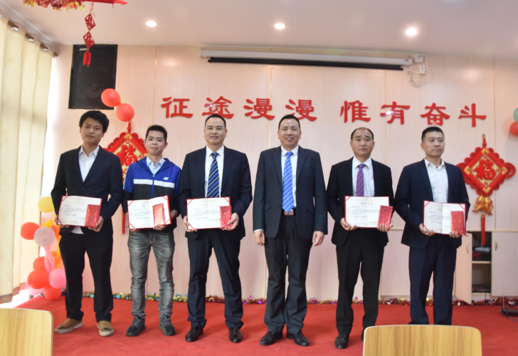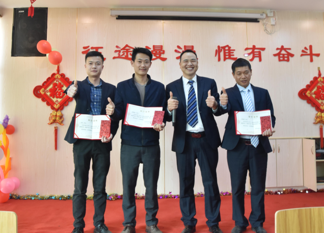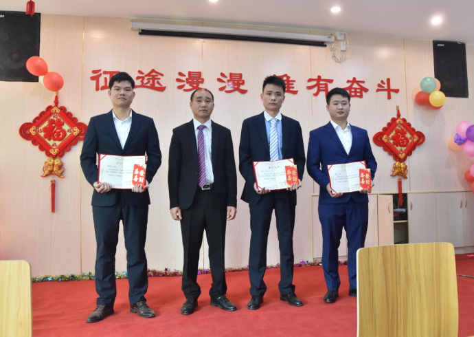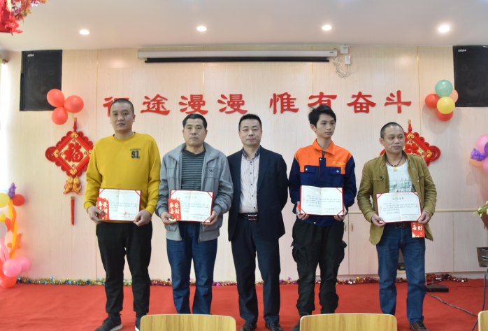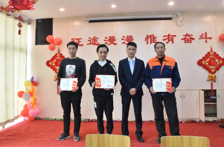 生產(chǎn)部經(jīng)理陽專為周偉群、胡勇波、李加龍、唐江明頒發(fā)先進(jìn)個(gè)人獎