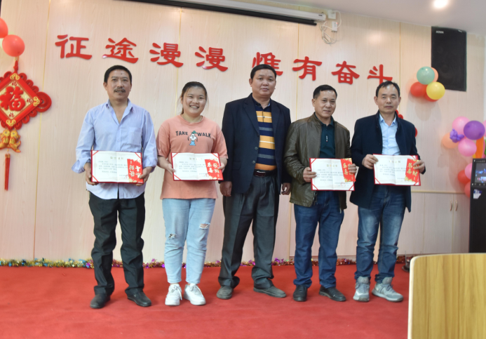 營銷部經(jīng)理伍綱強(qiáng)為邱高明、周美芳、黃榮先、龔超頒發(fā)先進(jìn)個(gè)人獎